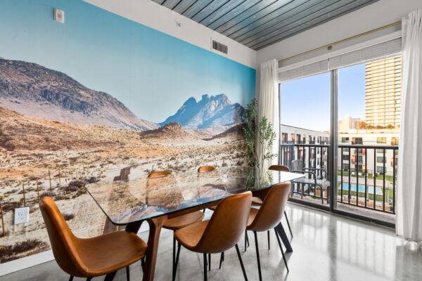 Bed, plunge lounge chair, dresser, Roku TV, dining table, desk and mirror at Lodgeur Upper Kirby