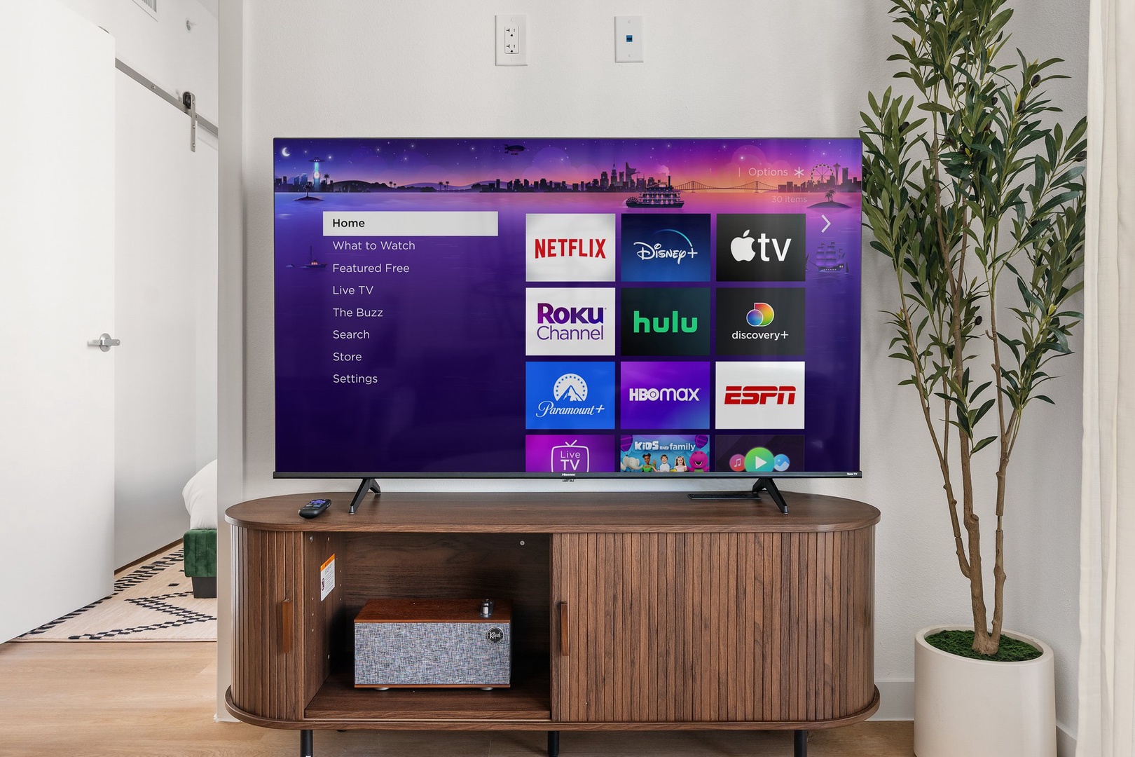 • Living area with sofa, armchairs, 58-inch smart TV (Roku), and Klipsch Bluetooth speaker