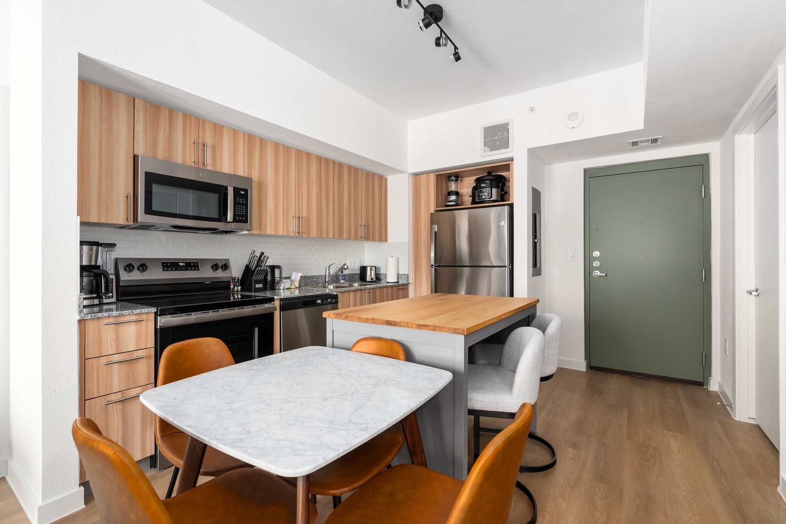 • Chef-ready kitchen with oven, large fridge-freezer, Ninja Foodie (10-in-1 5-quart pressure cooker and air fryer), cookware, bakeware, dinnerware