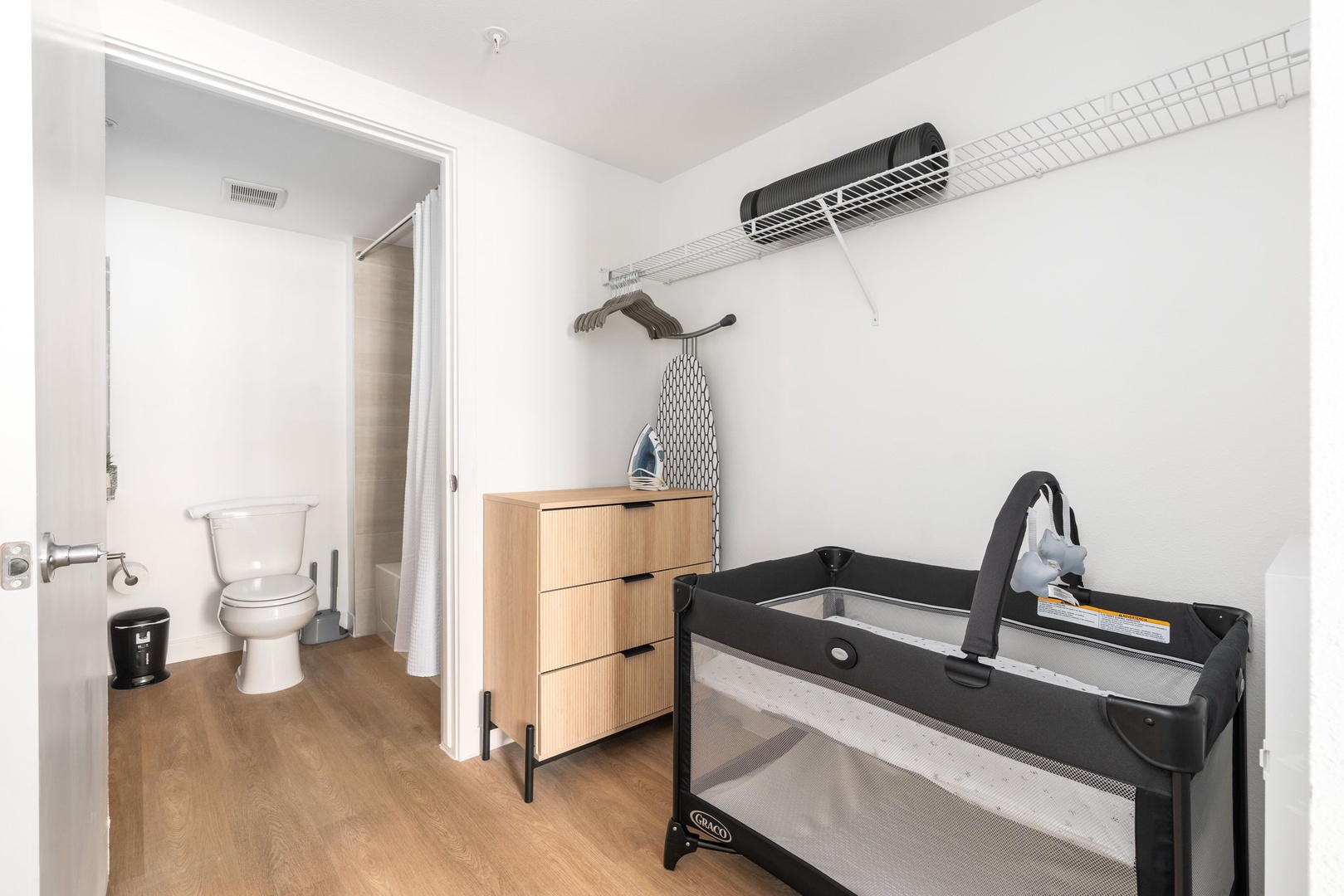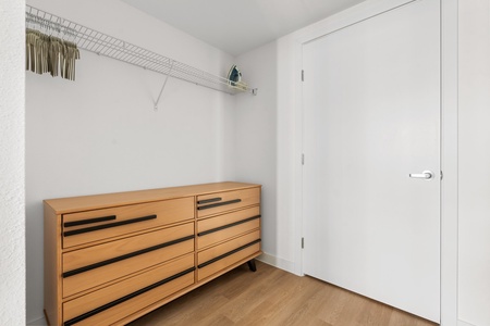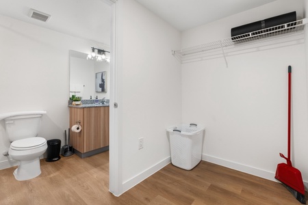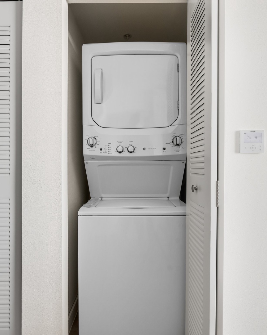 • In-unit washer and dryer, steam iron, and ironing board