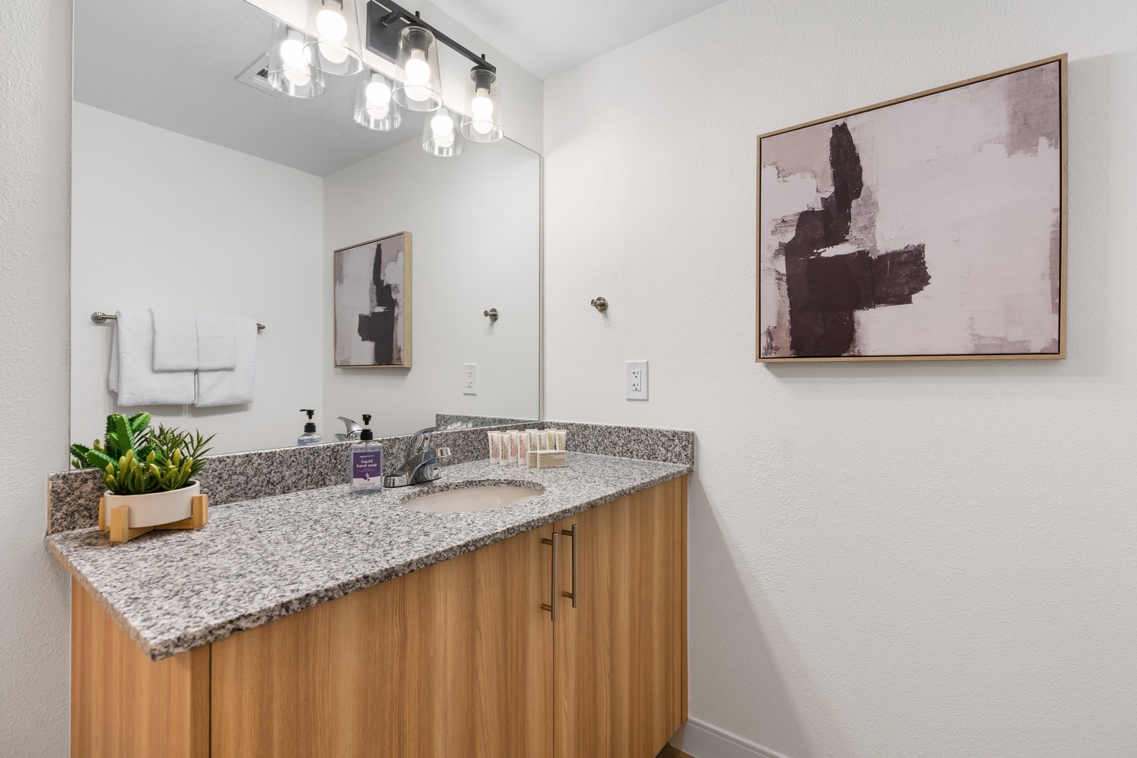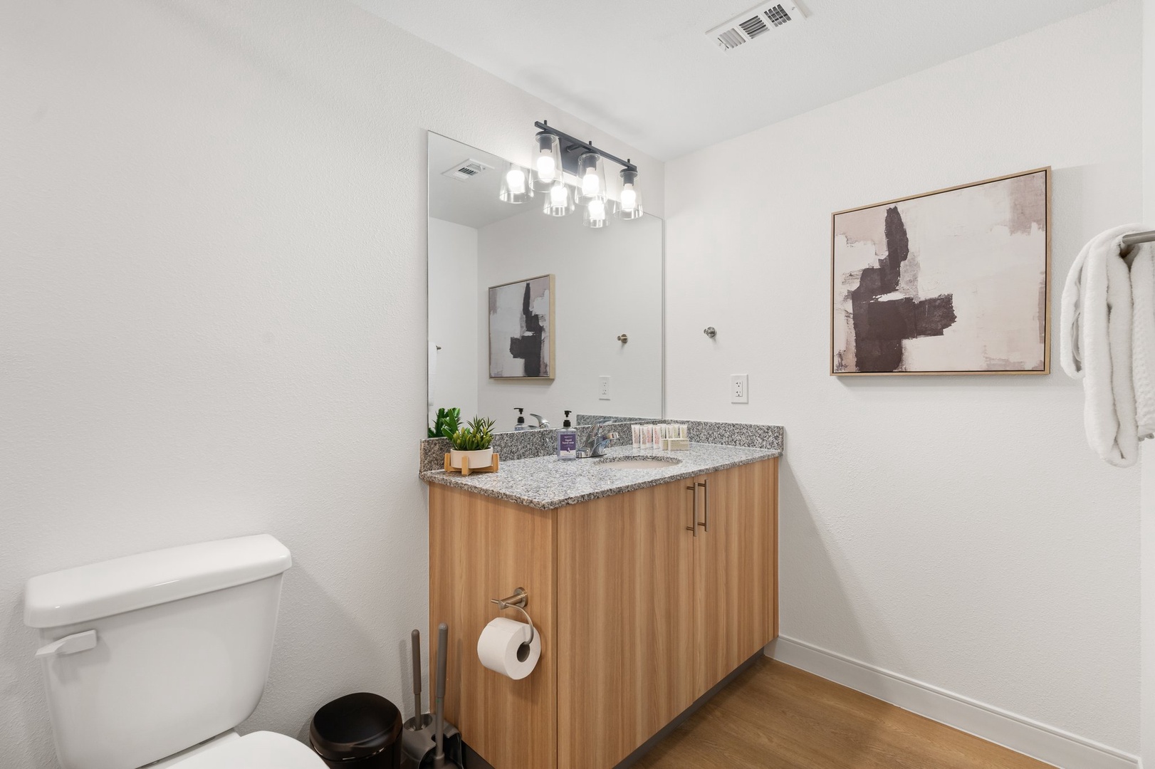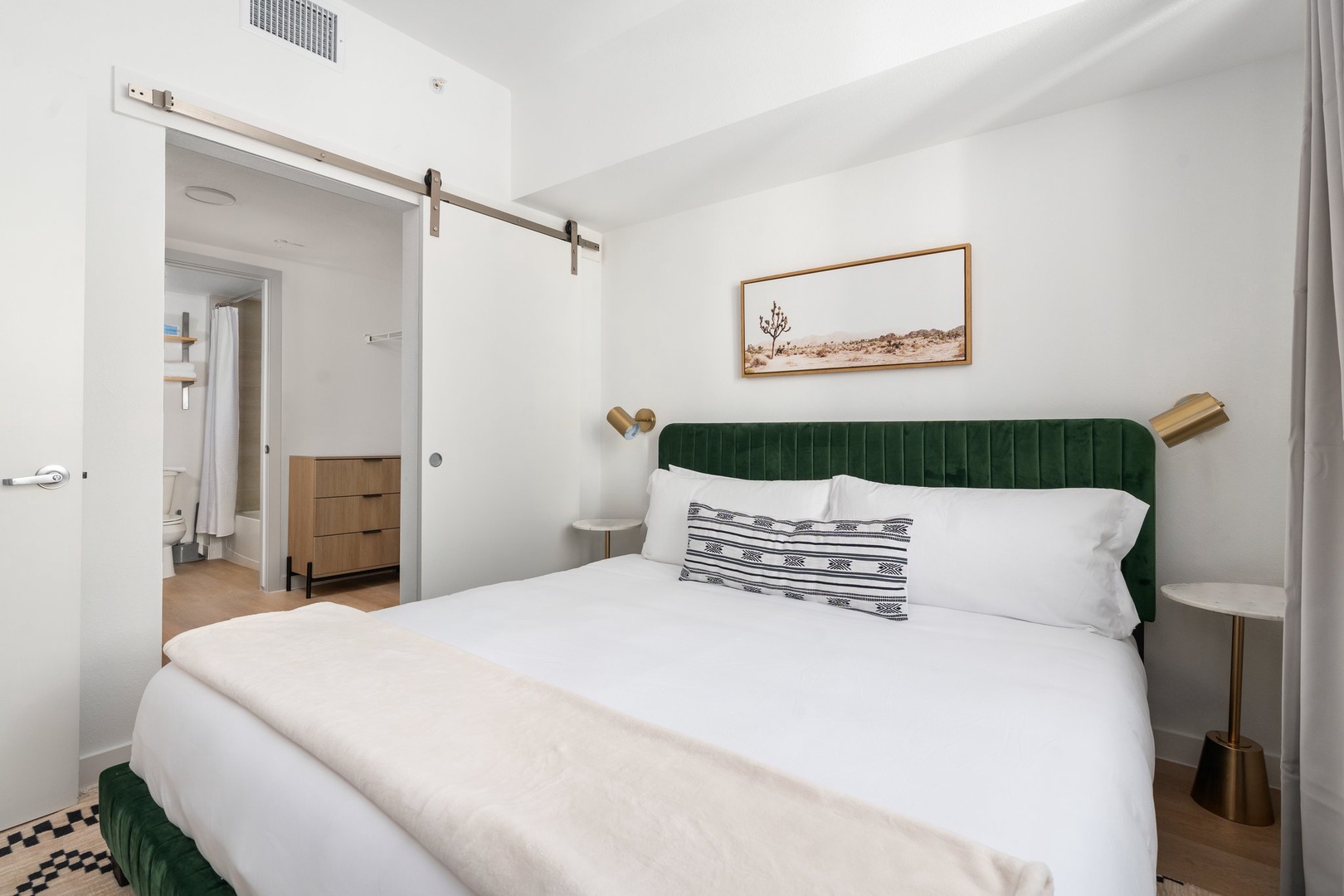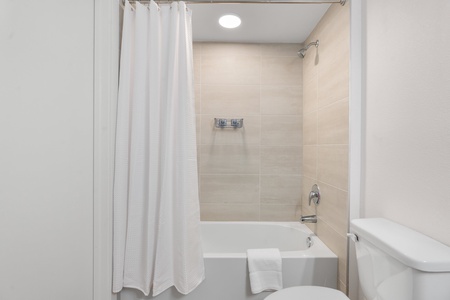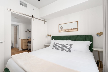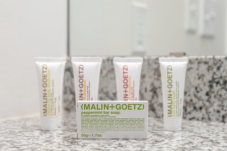 • Spacious bathrooms with bathtub and shower, posh MALIN+GOETZ toiletries, plush towels, hairdryer, and straightener