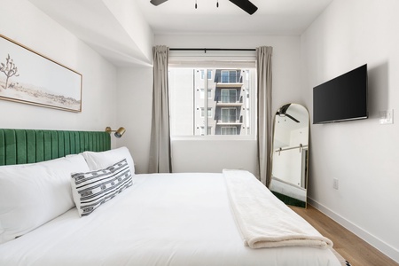 Experience a tranquil rest on a memory foam mattress in this cozy bedroom equipped with a 40' smart TV.