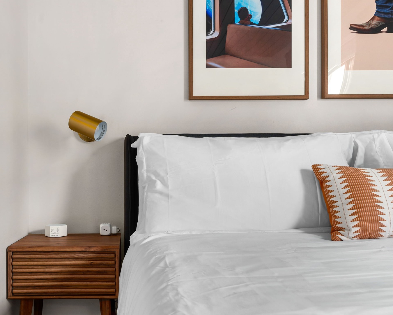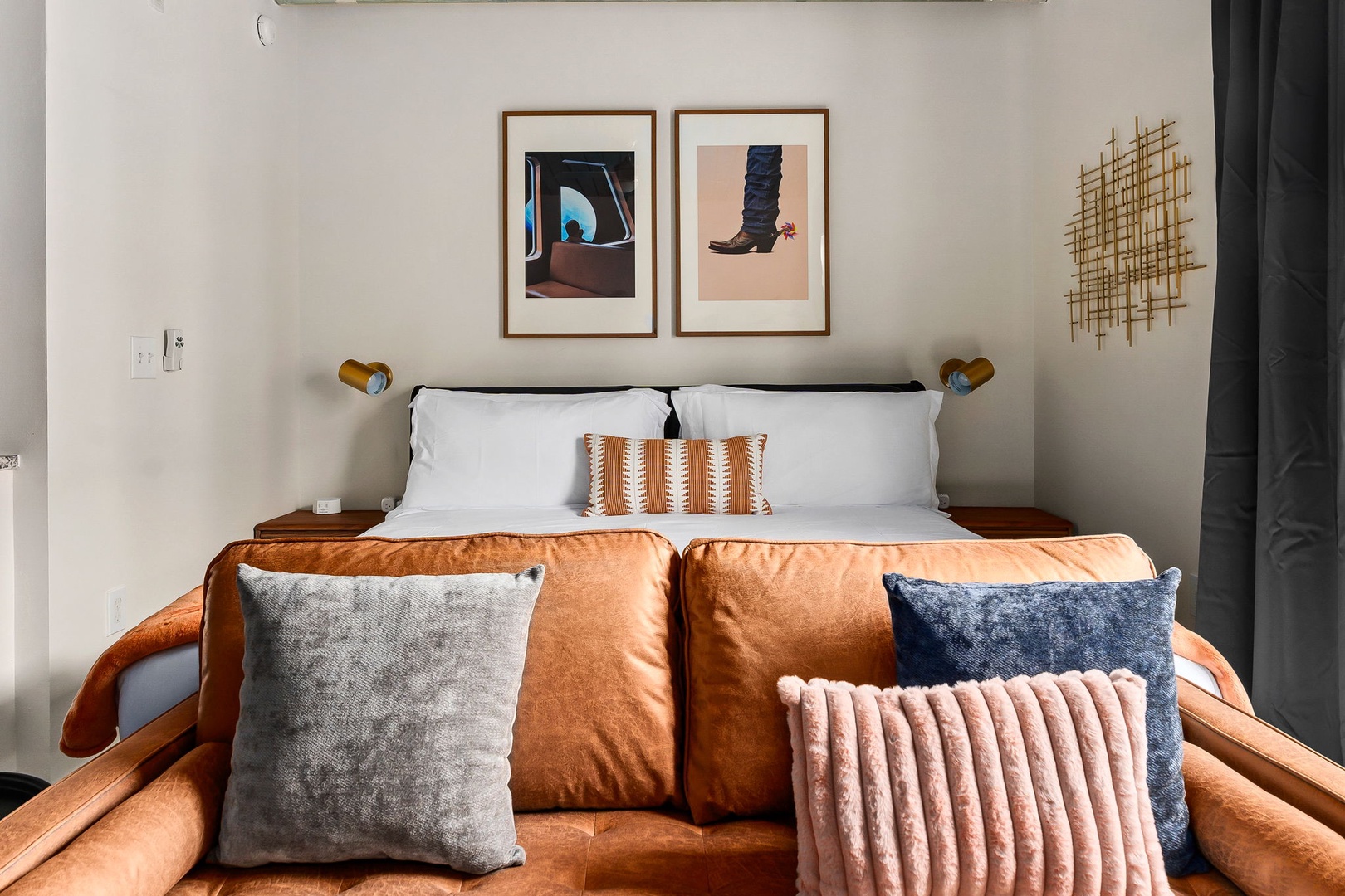 - Get a great night’s sleep in our comfortable king-size bed with a memory foam mattress, soft sheets, cozy pillows, blackout curtains, and a white noise machine