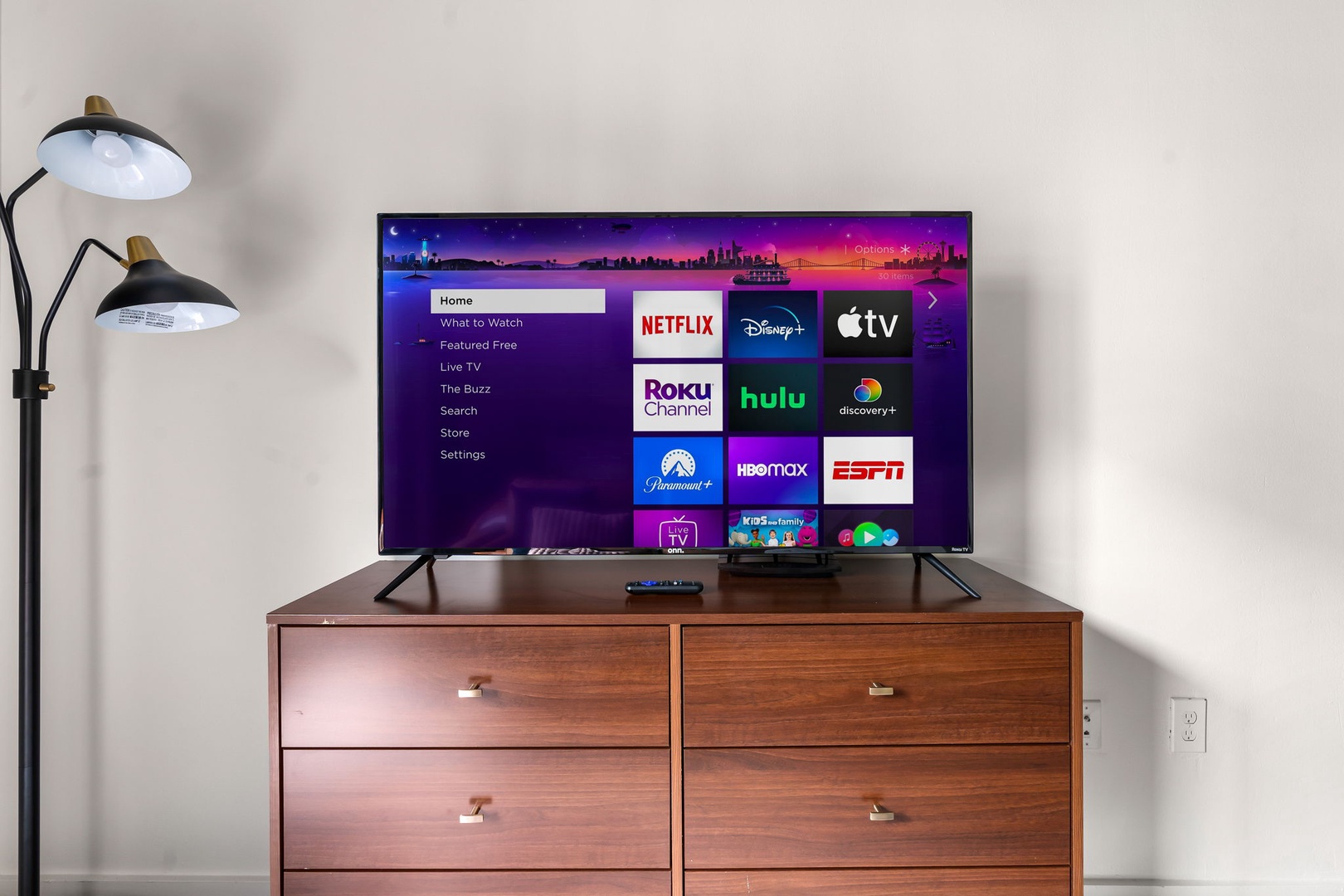 - Relax in a living room equipped with a sofa, armchair, 50-inch smart TV, and a Bluetooth speaker