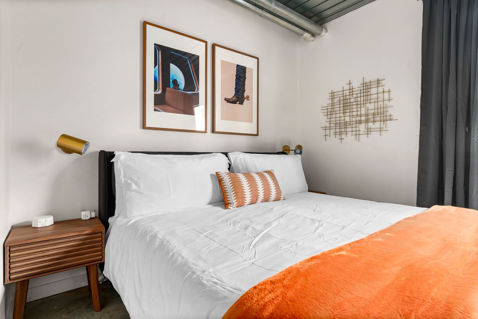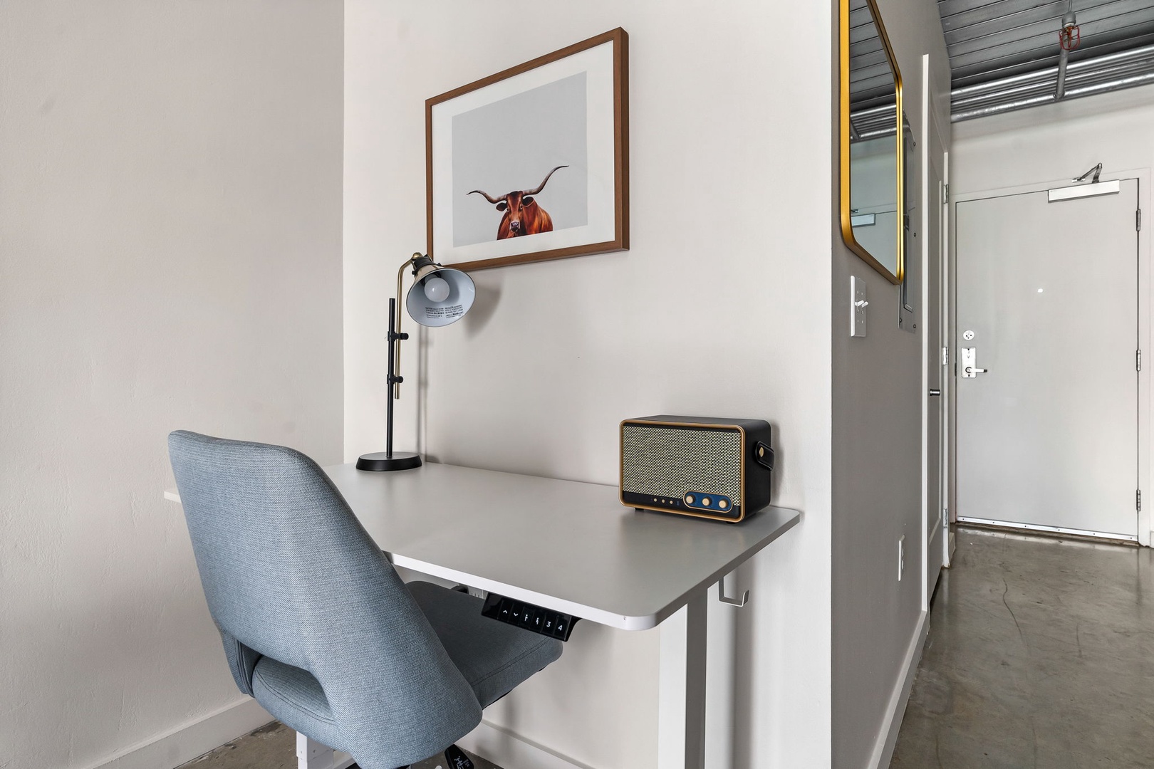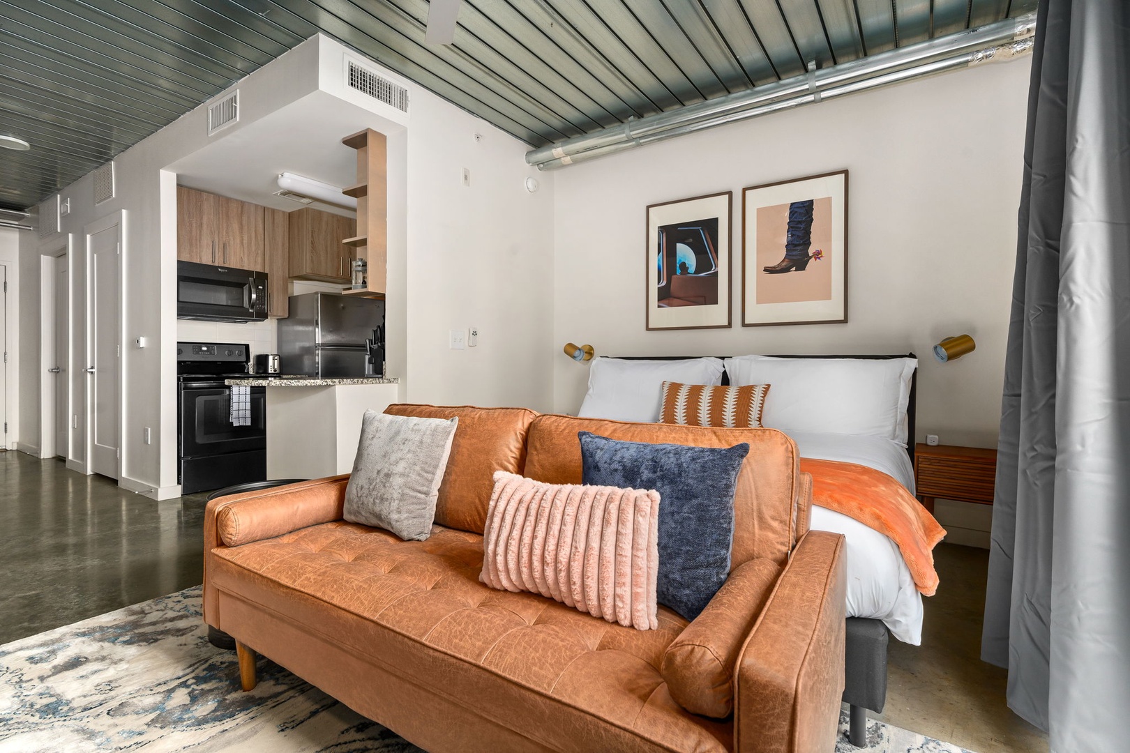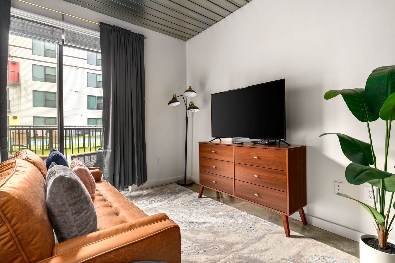 Welcome to Lodgeur at Mid Main Lofts! This trendy apartment community is in the heart of Midtown, Houston’s most walkable neighborhood. There are dozens of bars and restaurants on your doorstep and a METRORail station (3 stops to the Texas Medical Center or Downtown). This 4th-floor furnished studio apartment (512 SF) is perfect for short and extended stays, featuring a fully-equipped kitchen, washer/dryer, and a workspace with fast WiFi. Onsite, there’s free parking, a pool, and a 24/7 gym.