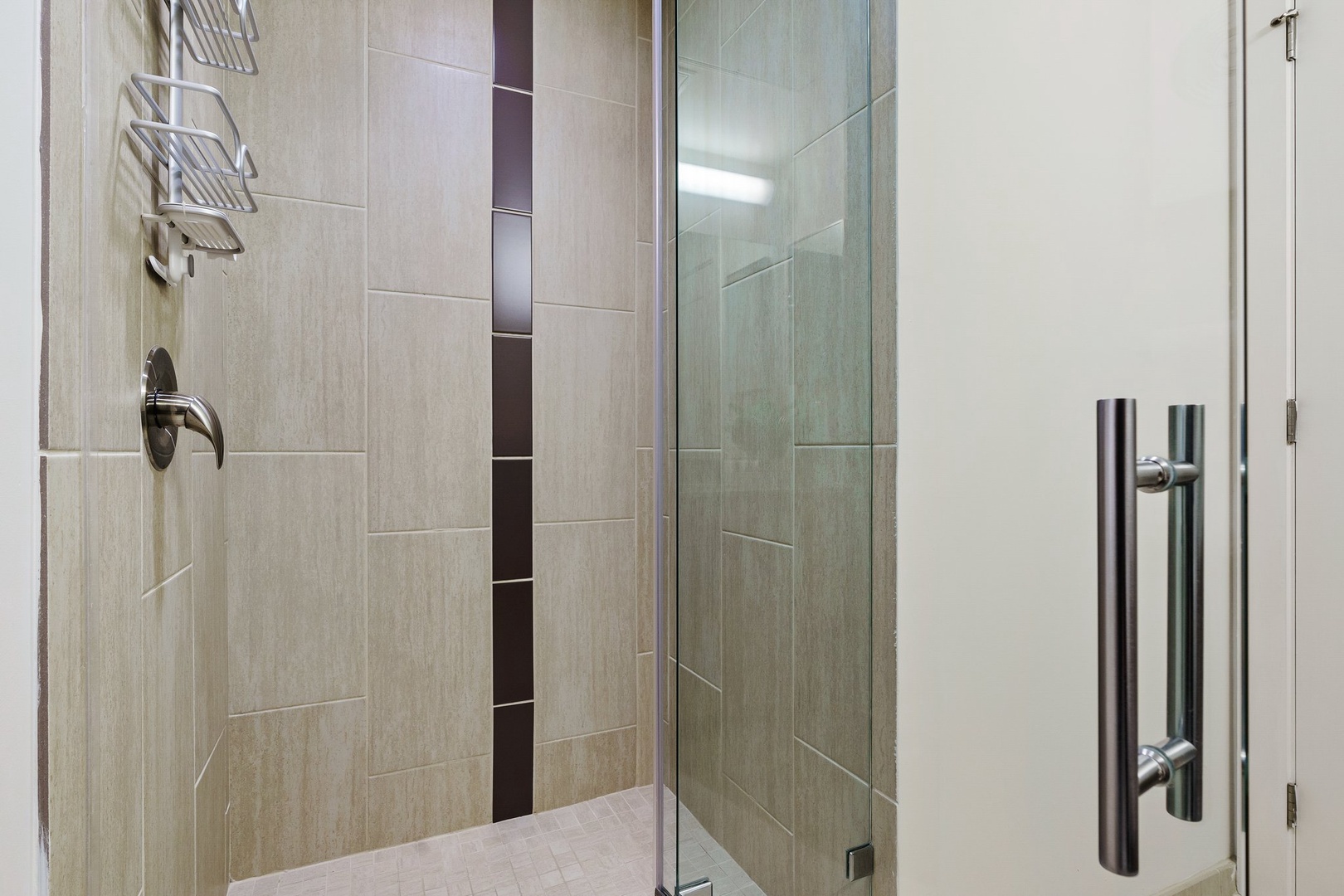 Enjoy a fresh start in the modern walk-in shower with stylish fixtures.