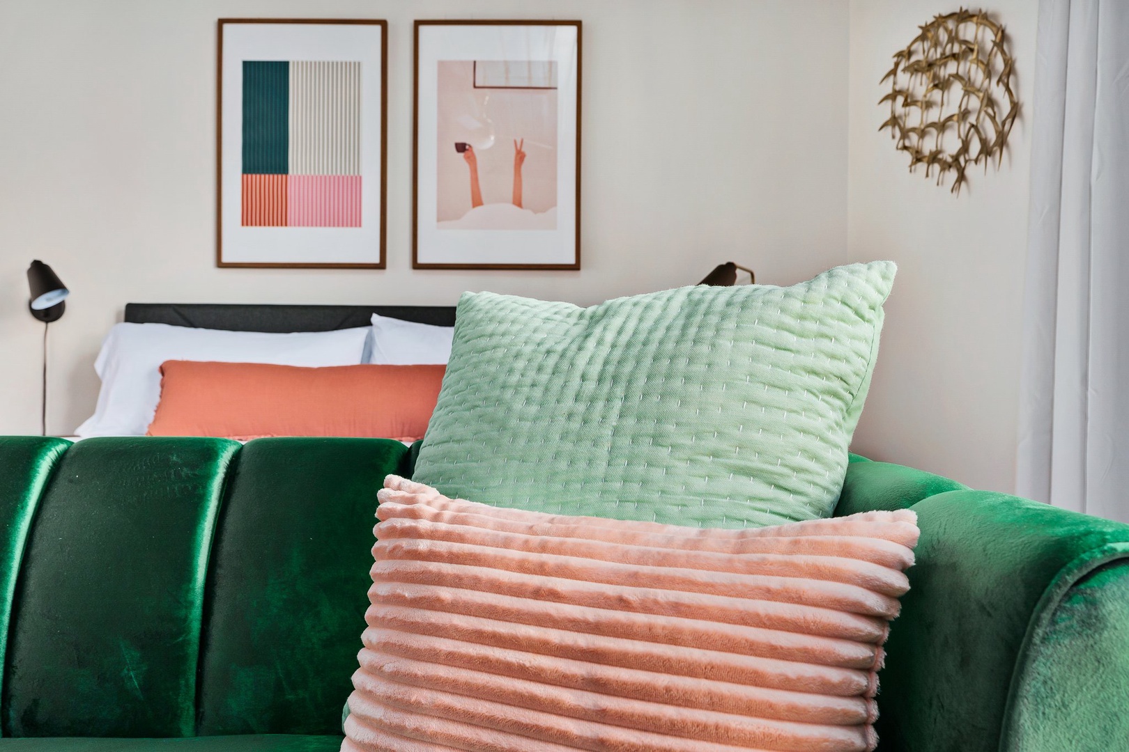 - Get a great night’s sleep in our comfortable king-size bed with a memory foam mattress, soft sheets, cozy pillows, blackout curtains, and a white noise machine