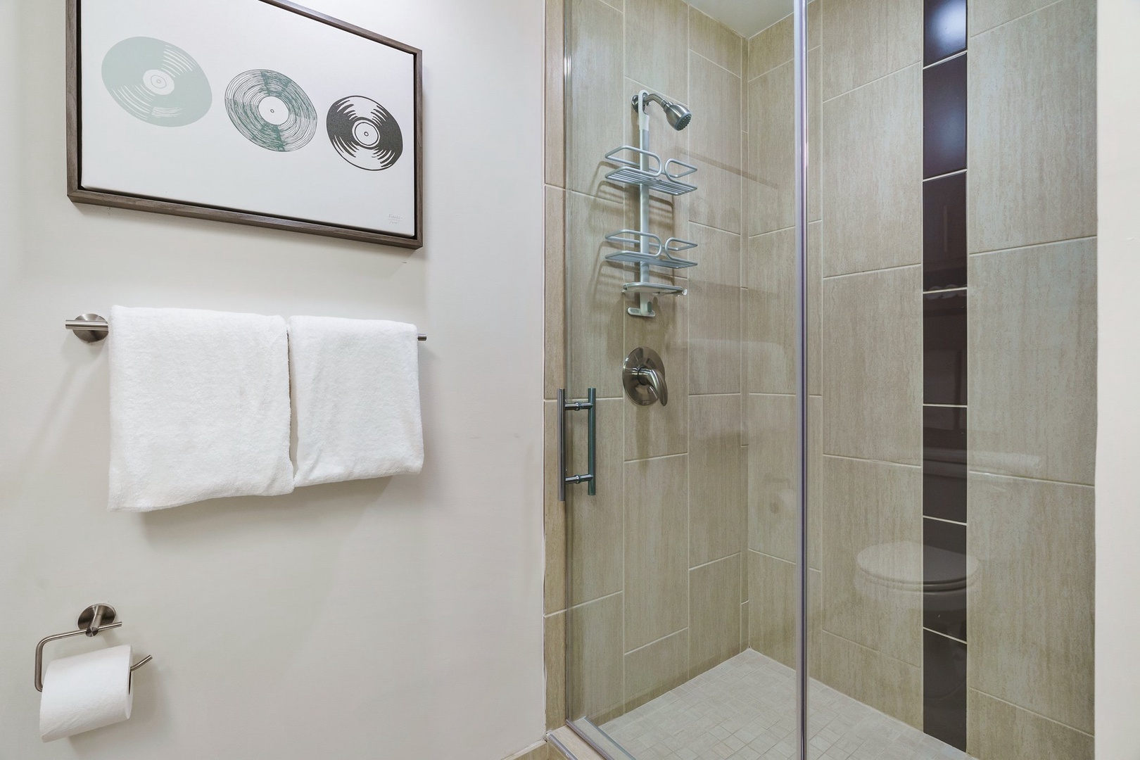 - Freshen up in a spacious bathroom with ample storage and a walk-in shower, MALIN+GOETZ toiletries, plush bath towels, pool towels, a hairdryer, and hair straightener / flat iron