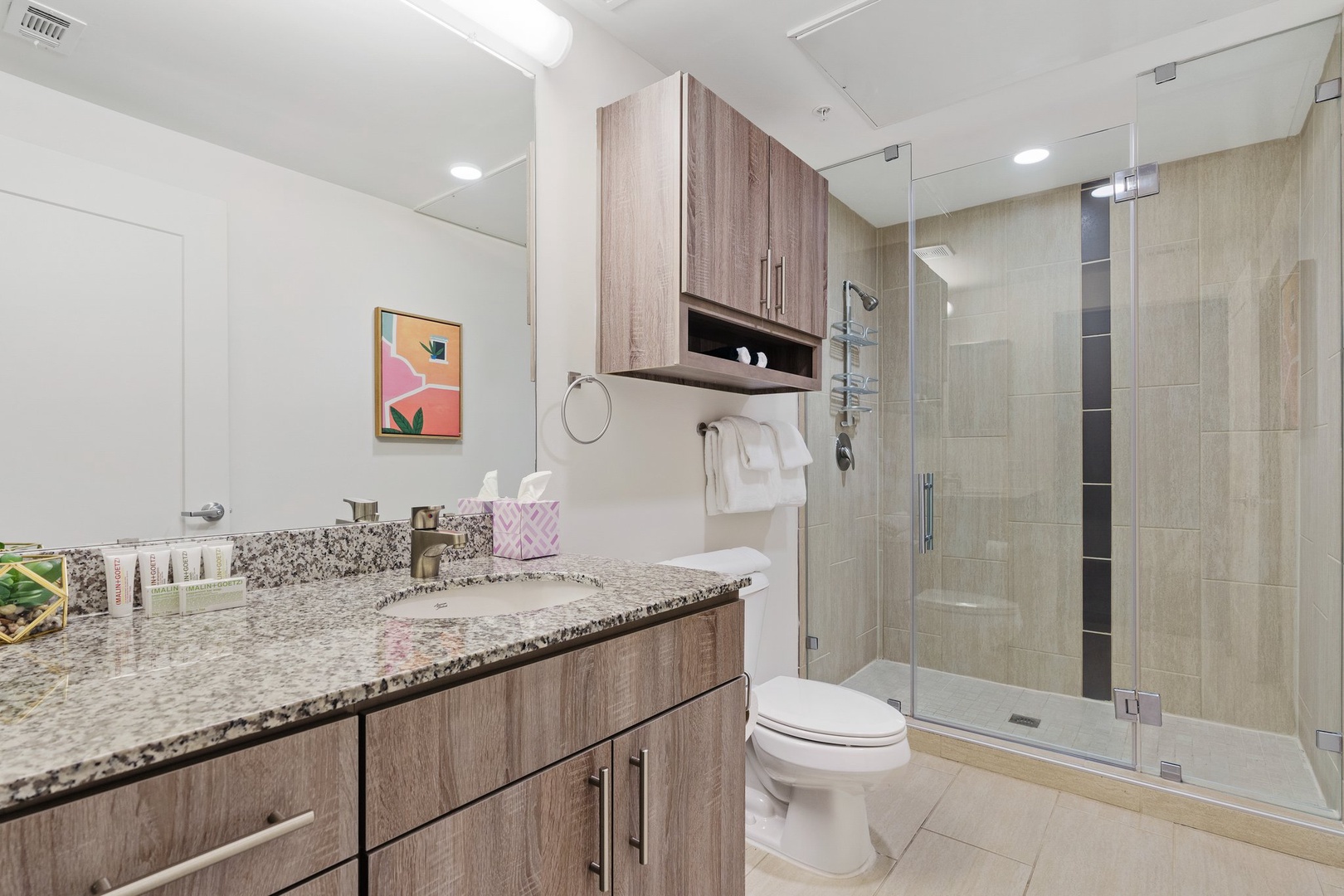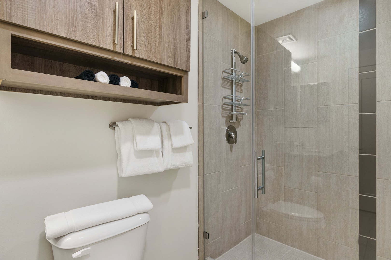- Freshen up in a spacious bathroom with ample storage and a walk-in shower, MALIN+GOETZ toiletries, plush bath towels, pool towels, a hairdryer, and hair straightener / flat iron