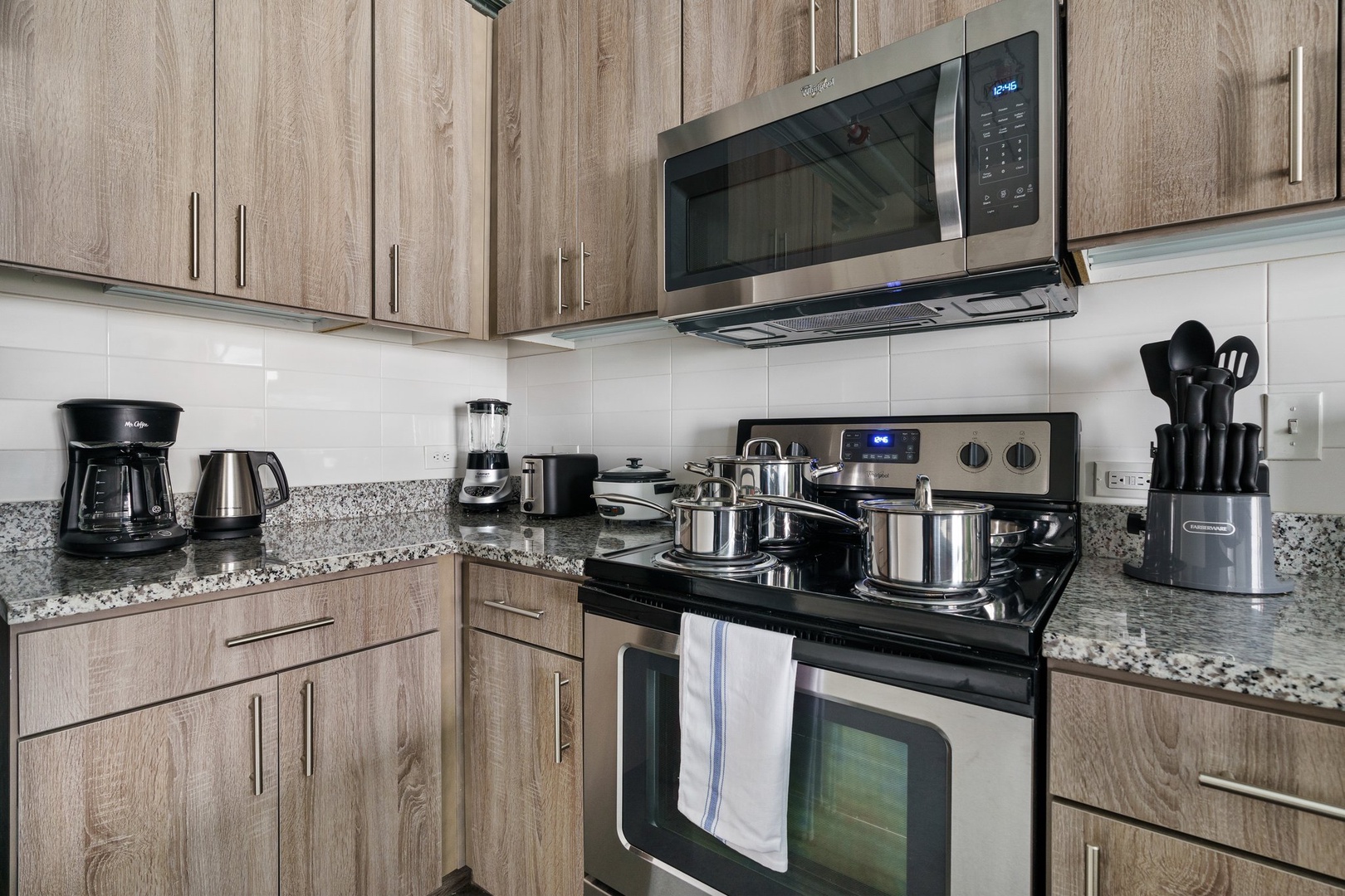 - Cook a meal in our fully equipped kitchens, which include a coffee maker, electric kettle, toaster, blender, rice cooker, Crockpot slow cooker, tri-ply cookware, bakeware, and more ready for use! Appliances include a stovetop, oven, fridge freezer, dishwasher, and a microwave