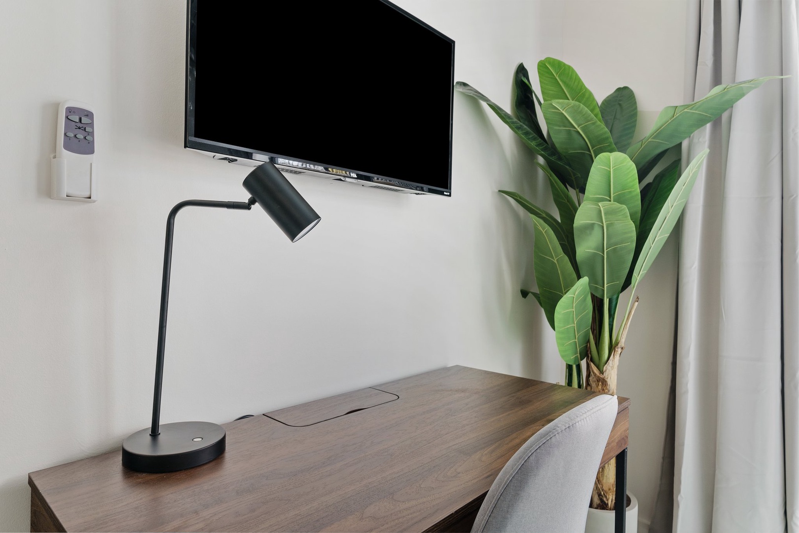- Work remotely with a desk, task lamp, office chair, and fast fiber internet WiFi (50+ Mbps)