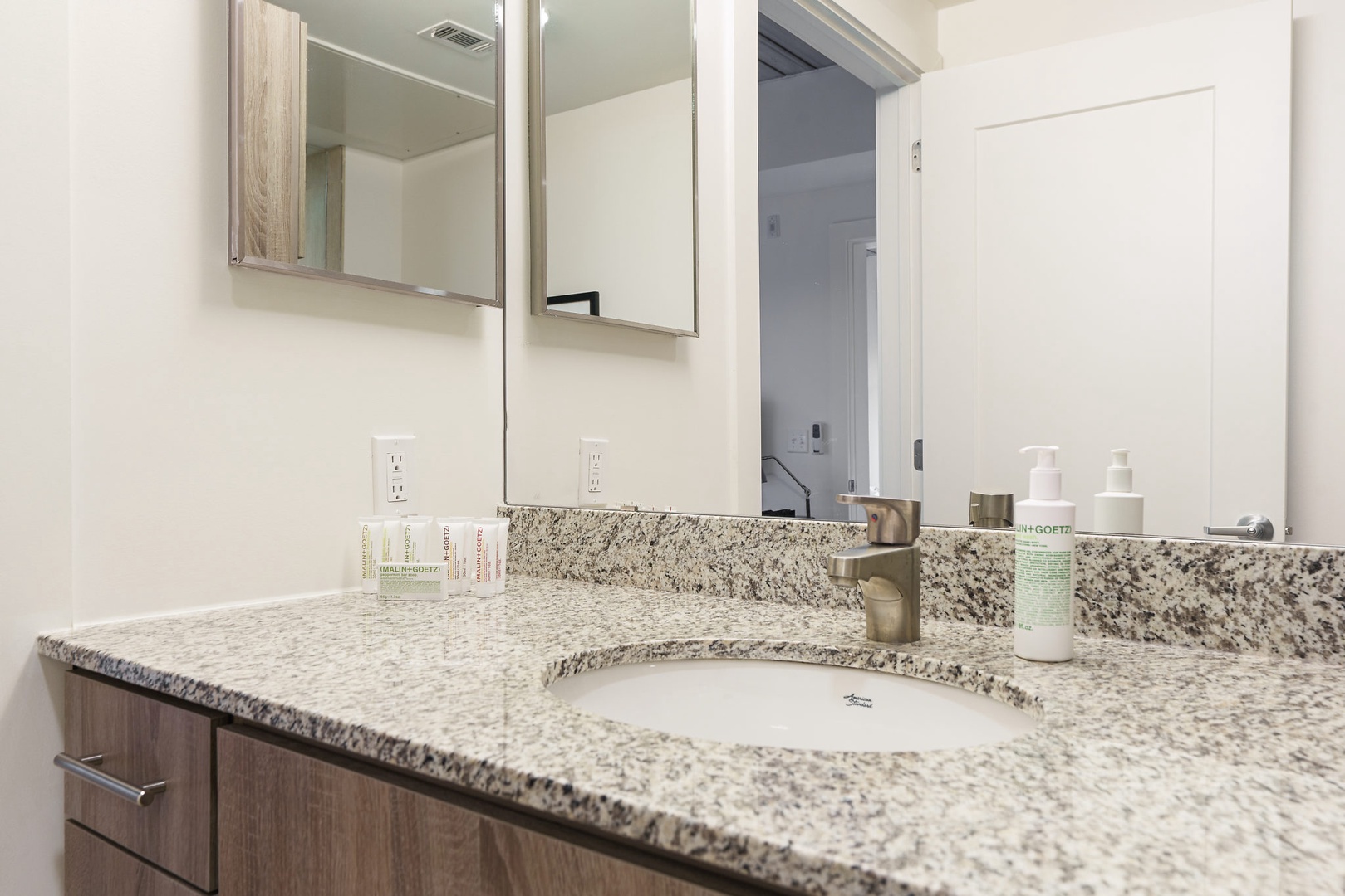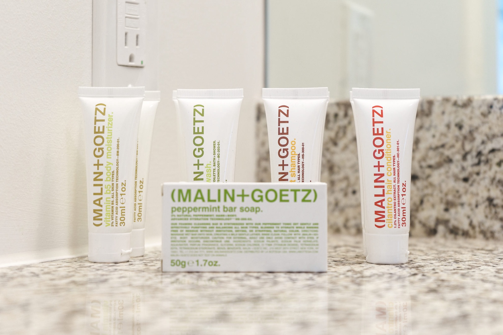 Cherish complimentary toiletries by Malin + Goetz in the bathroom.