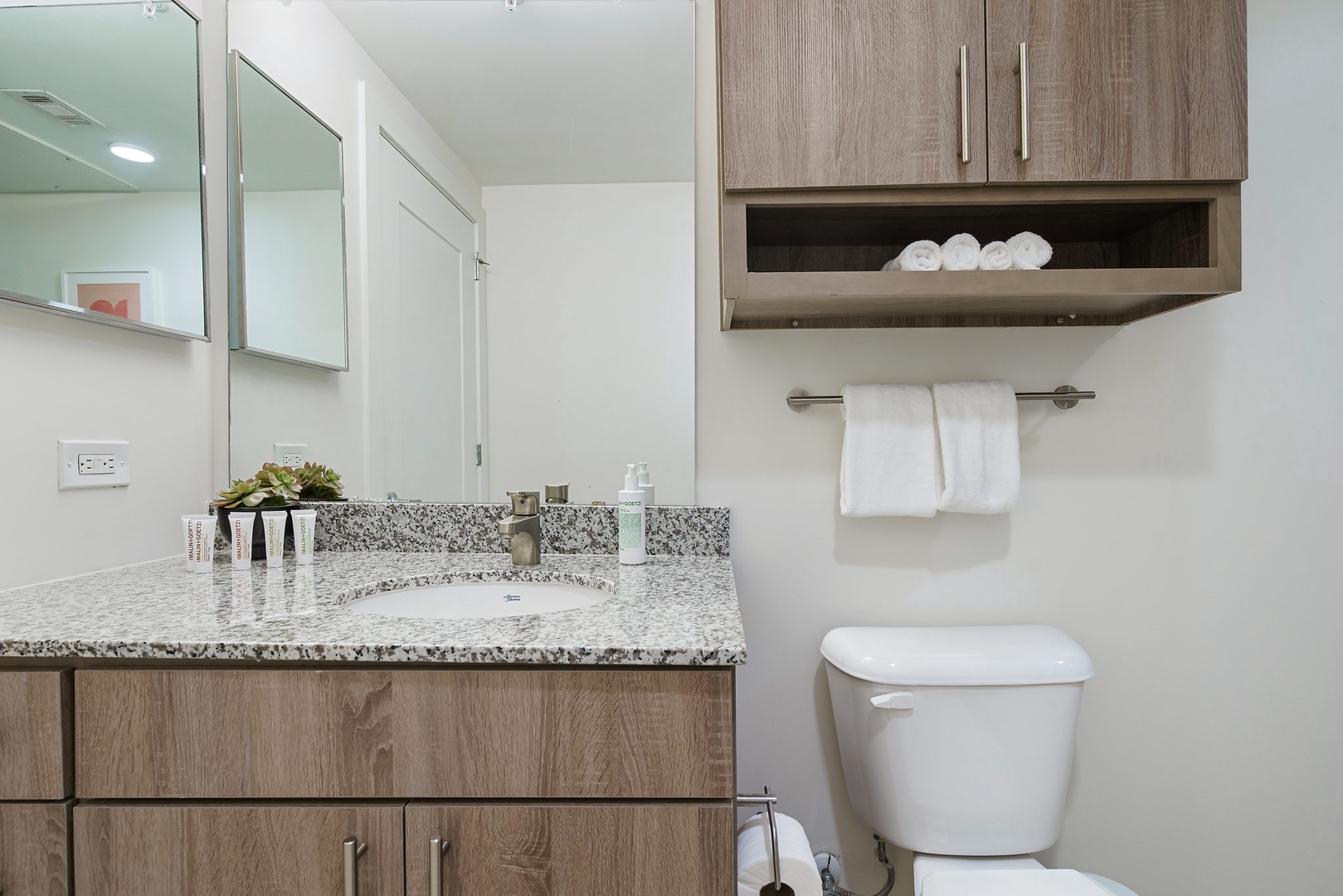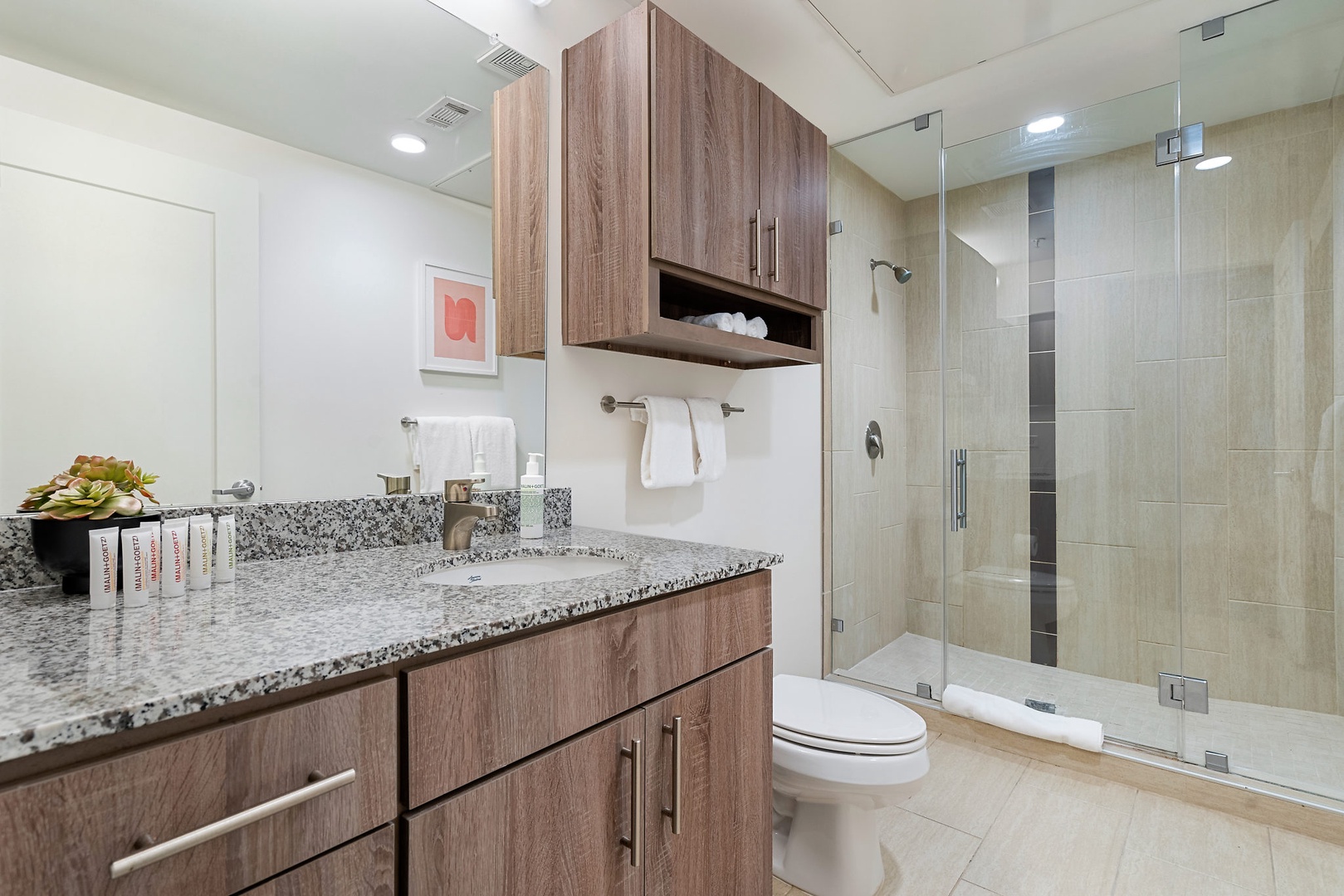 - Freshen up in a spacious bathroom with ample storage and a walk-in shower, MALIN+GOETZ toiletries, plush bath towels, pool towels, a hairdryer, and hair straightener / flat iron