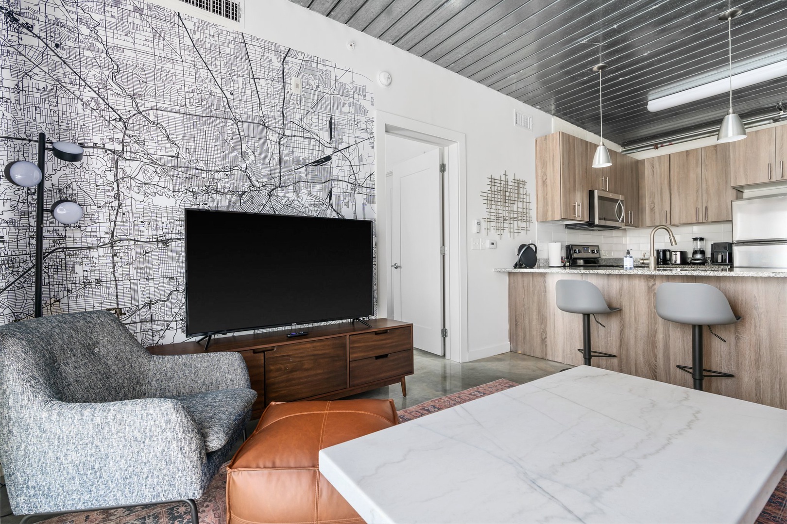 - Relax in a living room equipped with a sofa, armchair, 50-inch smart TV, and a Bluetooth speaker