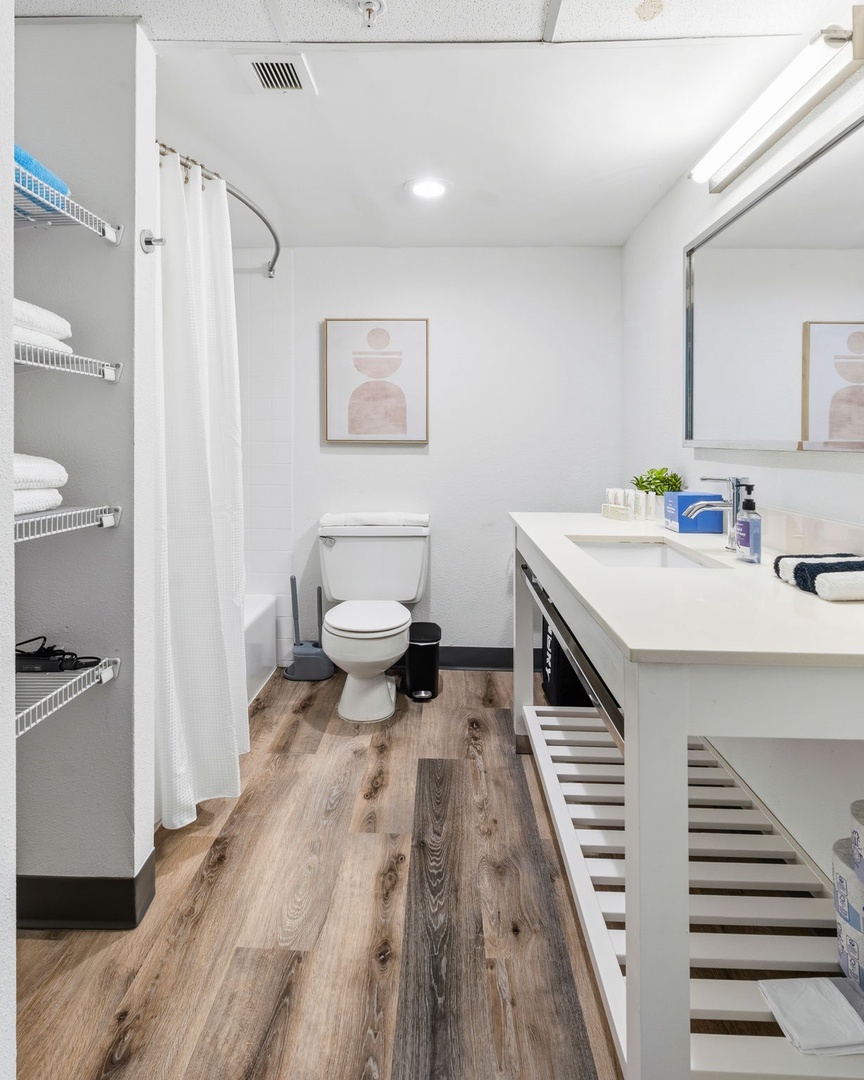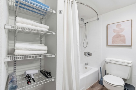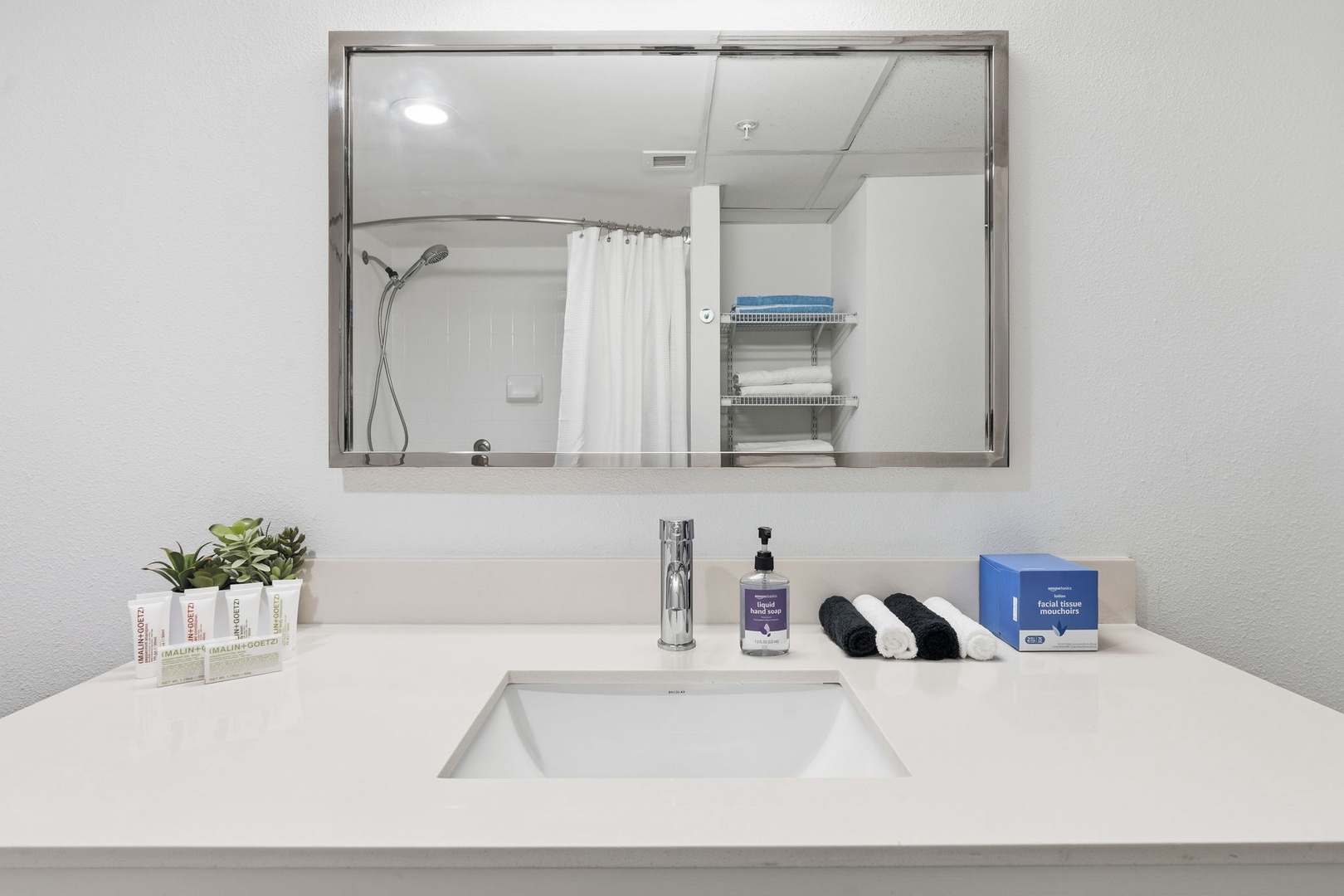 • Bathroom with shower/tub combo, MALIN+GOETZ toiletries, plush towels, hairdryer, and straightener