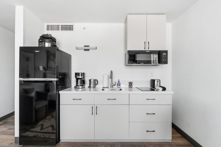 • Chef-ready kitchenette with induction cooktop, microwave, tall fridge-freezer, Ninja Foodi (10-in-1 pressure cooker + air fryer), cookware, and dinnerware