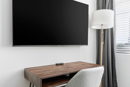 • Dedicated desk with ergonomic office chair, task lamp, and a Bluetooth speaker for music and podcasts
