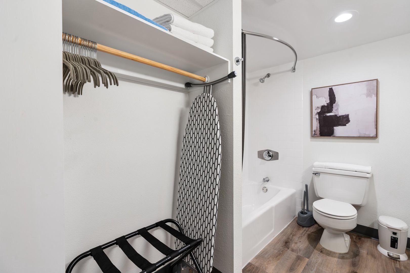 • Bathroom with shower/tub combo, MALIN+GOETZ toiletries, plush towels, hairdryer, and straightener
